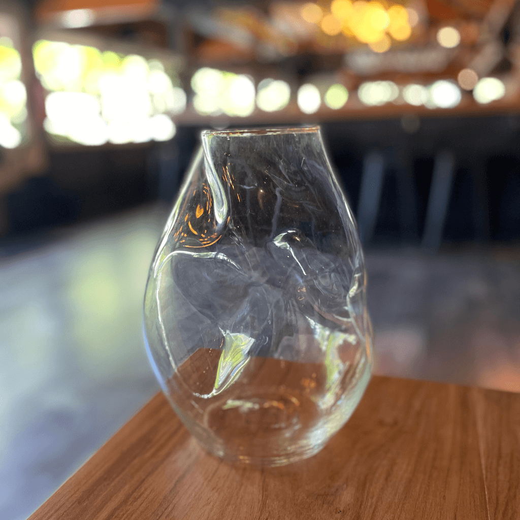 Florero de diseño orgánico en vidrio soplado, con formas irregulares que lo hacen único.