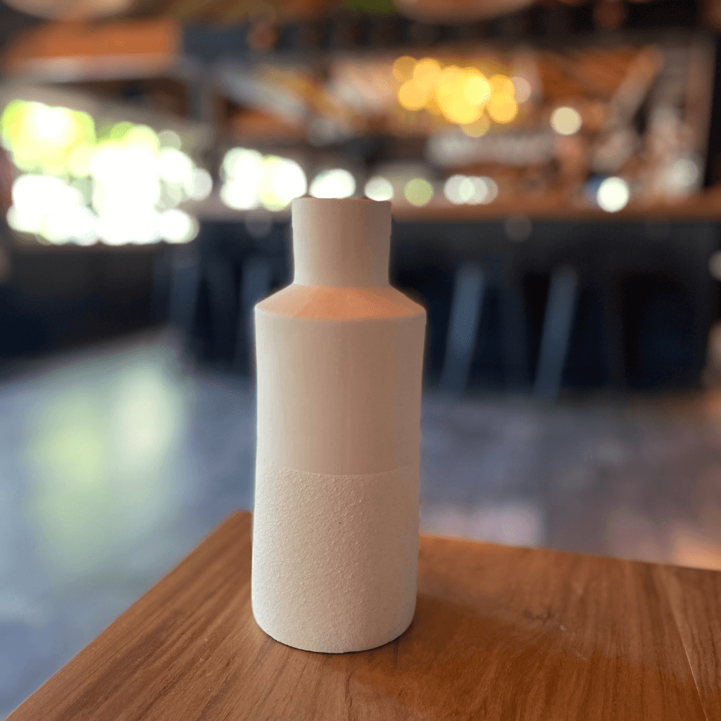 Disponible en dos combinaciones de color: blanco con blanco piedra y blanco con negro piedra, es una pieza versátil ideal para decorar mesas, estanterías o rincones especiales con flores o ramas secas. Su acabado artesanal le otorga un carácter único, manteniendo una estética sobria y atemporal.